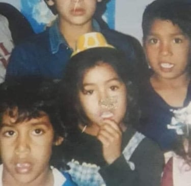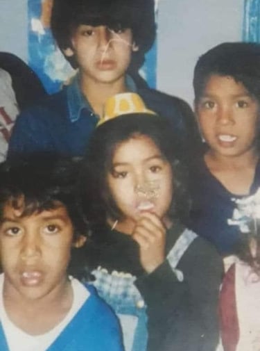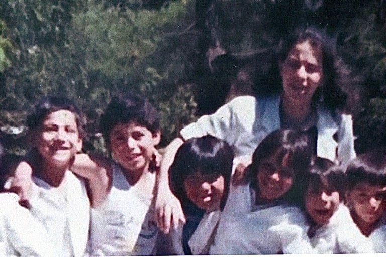 Fotos de Ezequiel, de pequeño, rodeado de amigos, amigas y sus hermanos y hermanas. En algunas fotos se lo puede ver disfrutando alguna fiesta de cumpleaños, en otras yendo o saliendo de la escuela primaria con el característico guardapolvos blanco. Siempre riendo y siempre celebrando la vida.
