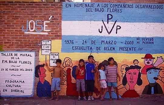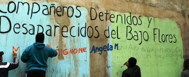 Murales de los detenidos desaparecidos del Bajo Flores. El de arriba en Barrio Rivadavia, a la derecha en el Barrio Illia II hecho por FM Bajo Flores (2009) y debajo un mural hecho en 2012 por organizaciones nucleadas en el Frente para le Victoria en la cancha del pollo de la Manzana 1 del Barrio Ricciardelli.