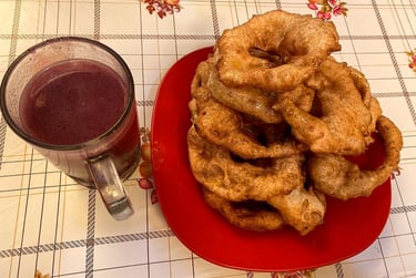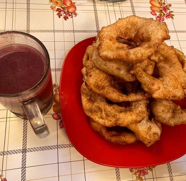 Api con buñuelos. Un día de frío nada mejor que desayunarse un api con buñuelos. Un desayuno típico de la colectividad boliviana. De alto contenido calórico, es un desayuno que levanta el espíritu y da alegría (y calor). Receta: https://www.youtube.com/watch?v=Z3baGv0LjK8
