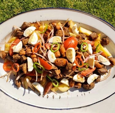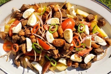Pique a lo Macho. Una especialidad de la gastronomía boliviana. Fácil de encontrar en los restaurantes de la Avenida Perito Moreno. Receta: https://www.youtube.com/watch?v=xbyvpohMRU4