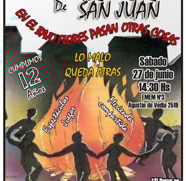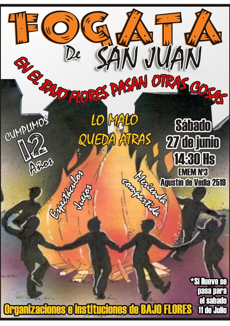 En Bajo Flores la tradición empezó en el año 2003 de la mano de Patricia Miranda y muchos otros compañeros y compañeras. Había sido un año muy duro el 2003 para el barrio. Veníamos del 2001, 2002, crisis social y económica y lo de Ezequiel Demonty. Ese año la Policía había sido particularmente violenta con los pibes y pibas del barrio y a Patricia se le ocurrió que podía ser una buena manera de dejar todo lo malo atrás armar una Fogata de San Juan...para dejar lo malo atrás. Sin olvidar pero poder superar entre todos esos momentos de tanto dolor para nuestro barrio.