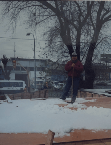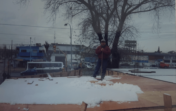 El día que nevó en 2009 Henry juntó la nieve en el techo de Mate Cosido y posó para inmortalizar ese día en la mítica esquina de Agustín de Vedia y Cruz.-