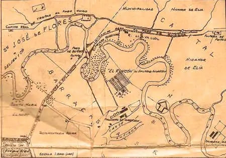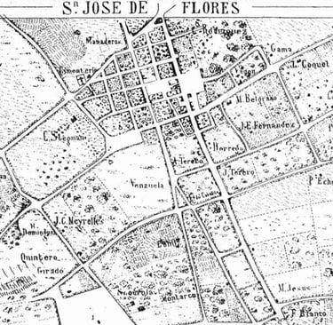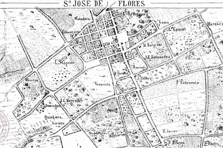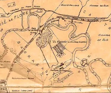 Mapa del Partido de San José de Flores donde se pueden apreciar arroyos y brazos del Riachuelo.
