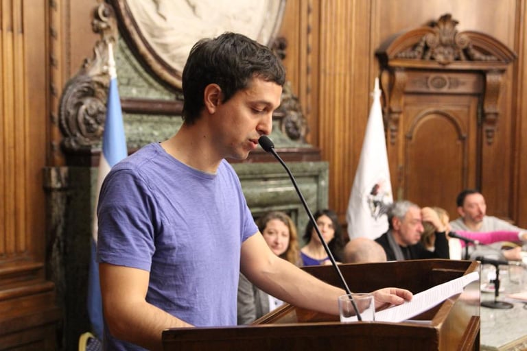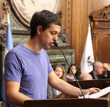 El entonces Comunero del peronismo Julian Cappa haciendo uso de la palabra en la audiencia pública en la Legislatura por el cambio de nombre del barrio.