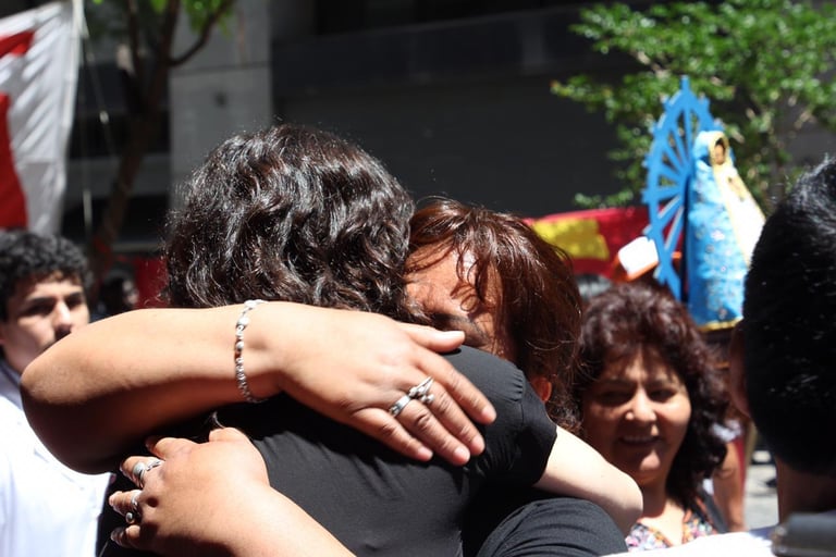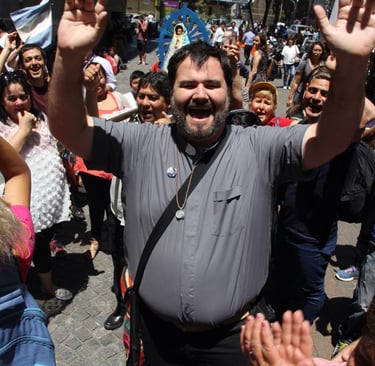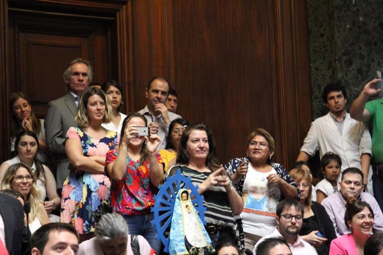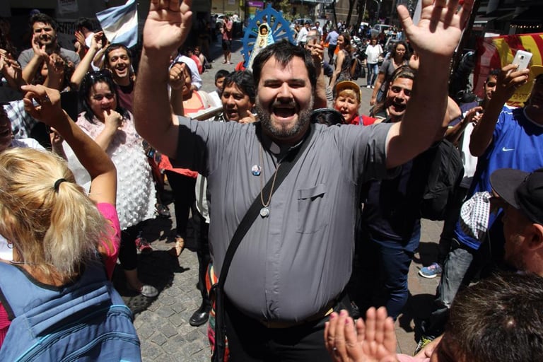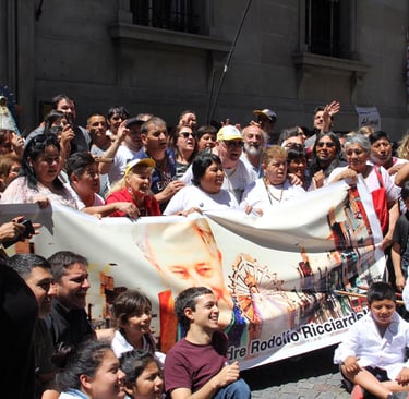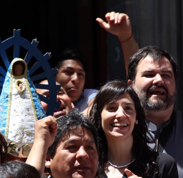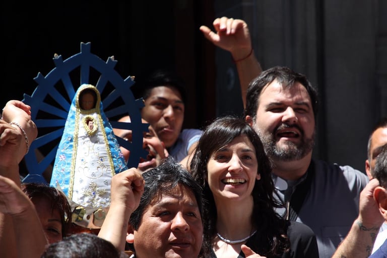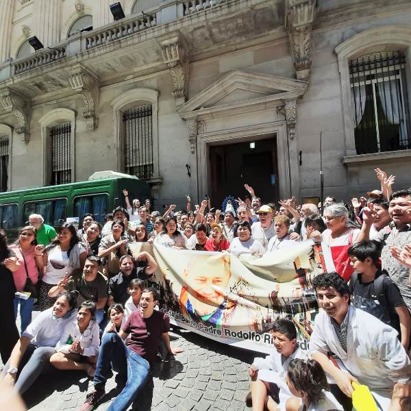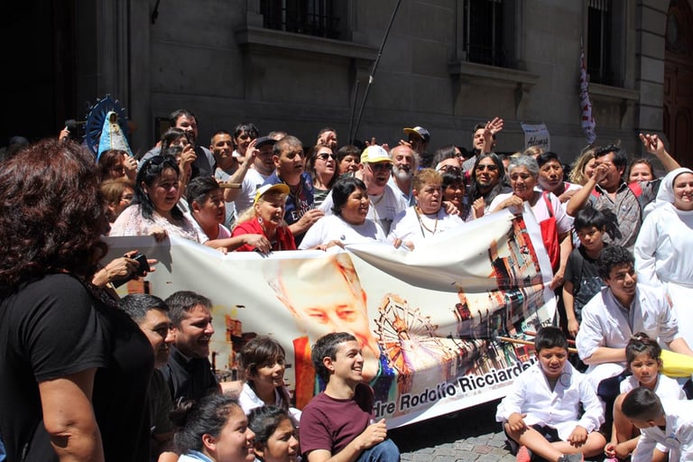 La Vírgen, la legisladora Penacca y el Padre Juan Isasmendi en la puerta de la Legislatura al grito de "Ricciardelli...barrio Ricciardelli..."