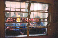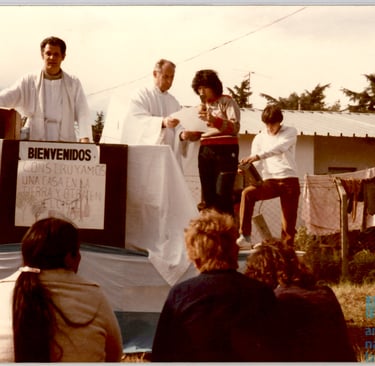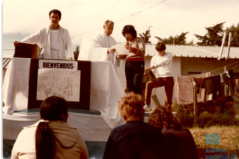 El Padre "Richar" dando misa. En el cartel se lée: "Bienvenidos. Construyamos una casa en la tierra y otra en la ...." . Fotografía cedida por el Archivo Nacional de la Memoria.