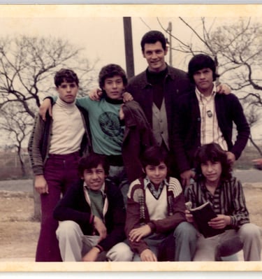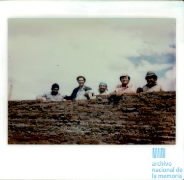 El Padre "Richar" junto a un grupo de jóvenes en el Barrio que ahora lleva su nombre. Fotografía cedida por el Archivo Nacional de la Memoria.