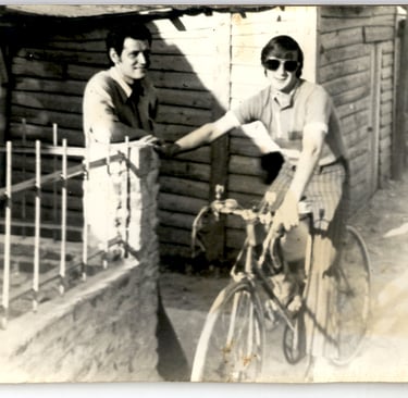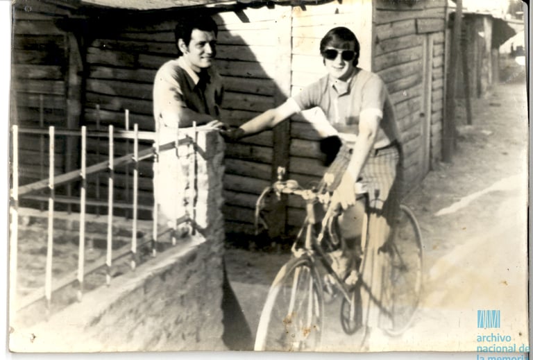 "Richar" conversando con un vecino que lo visita en bicicleta. De fondo se ven las casas construidas de madera y chapa. Fotografía cedida por el Archivo Nacional de la Memoria.