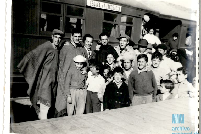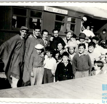 El Padre "Richar" vestido con un poncho junto a un grupo de colegas y niños en una estación de tren. Todo parece indicar que se trata de un viaje en el que niños conocen por primera vez el "sur" de nuestro país.