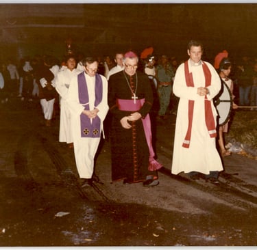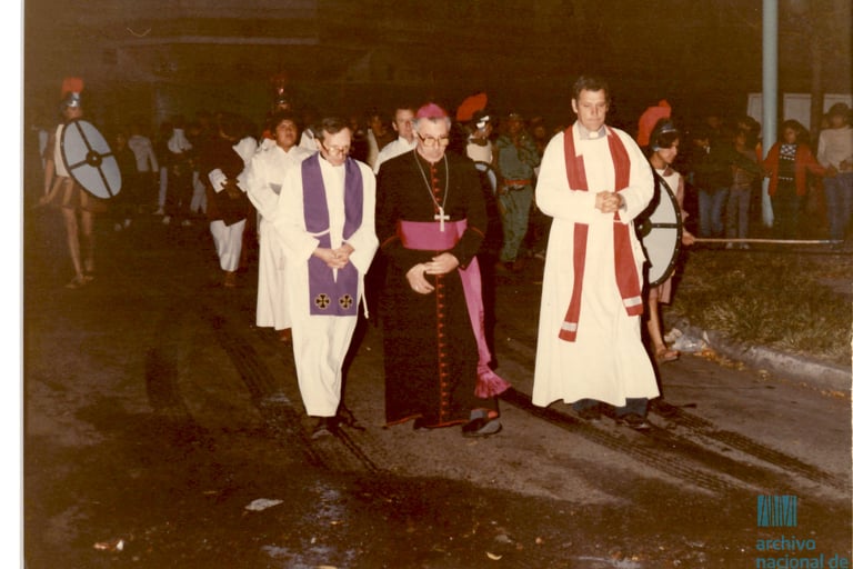 Rodolfo Ricciardelli junto a otros curas llevando adelante la procesión del Vía Crucis. Foto cedida por el Archivo Nacional de la Memoria.