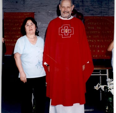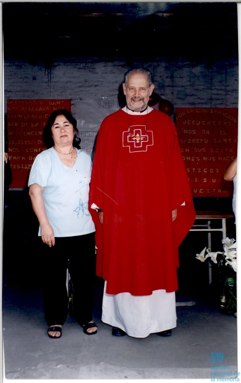 El Padre Rodolfo Ricciardelli con sotana roja y una vecina del barrio. Foto cedida por el Archivo Nacional de la Memoria.