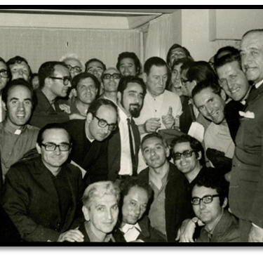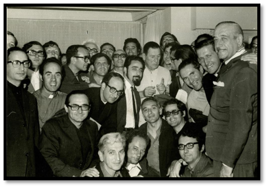 El Padre Rodolfo Ricciardelli, sonriente, junto Juan Domingo Perón en la residencia del General en Gaspar Campos. También se ven otros Curas del Movimiento de Sacerdotes del Tercer mundo como Domingo Bresci. El encuentro se produjo el 9 de diciembre de 1972. Fuente:https://www.pagina12.com.ar/506689-a-50-anos-del-encuentro-de-peron-y-los-curas-del-tercer-mund