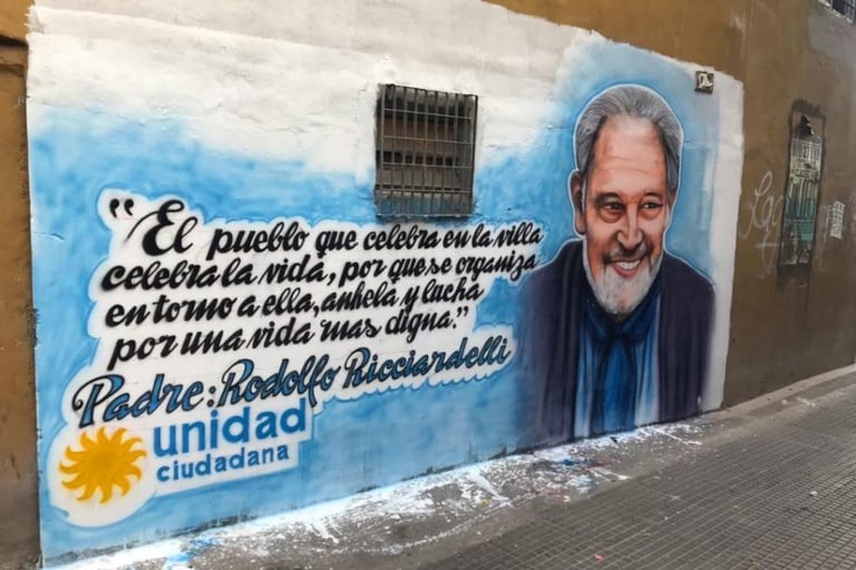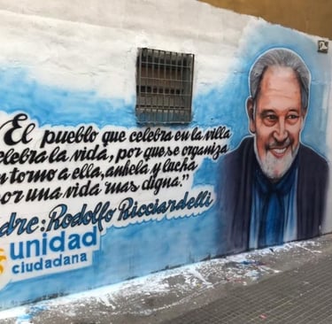 Mural del P Rodolfo Ricciardelli en la Manzana 1 de la ex villa 1-11-14 realizado por militantes peronistas del barrio. Se lée la siguiente frase: "El Pueblo que celebra en la villa celebra la vida porque se organiza en torno a ella, anhela y lucha por una vida más digna".