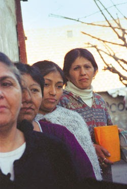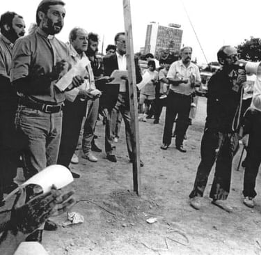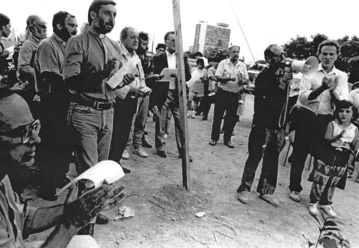 Ernesto Narcisi y otros curas durante la huelga de hambre de los Curas Villeros durante los años 90 en defensa de los vecinos de la VIlla 31 que sufrían violencia policial por la construcción de la autopista Illia.