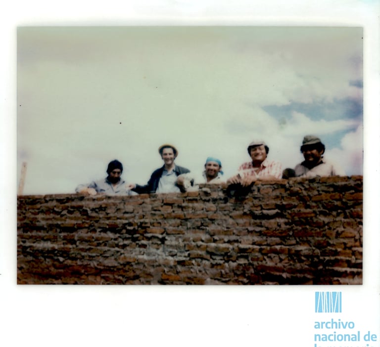 Vecinos trabajando en la construcción junto al Padre Ricciardelli. Es posible que se trate de la construcción de viviendas llevada adelante desde Madre del Pueblo en La Matanza donde la última dictadura cívico militar trasladó a miles de familias del Bajo Flores de manera forzosa. Fotografía cedida por el Archivo Nacional de la Memoria.